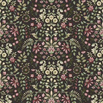 Matná, černá vliesová tapeta s ornamentálním květinovým vzorem v zelené a vínové barvě na podkladě imitující jemnou omítku.