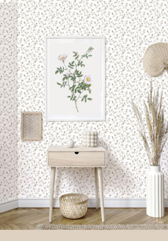 Matná, bílá vliesová tapeta s květinovým vzorem šedo-béžových větviček s květy a plody, podklad imitující jemnou omítku.
