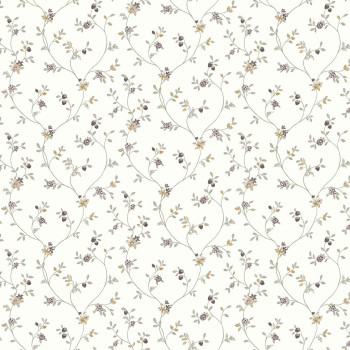 Matná, bílá vliesová tapeta s květinovým vzorem šedo-zelených větviček s květy a plody, podklad imitující jemnou omítku. Foto interiéru je pouze ilustrační - odlišné barvy.