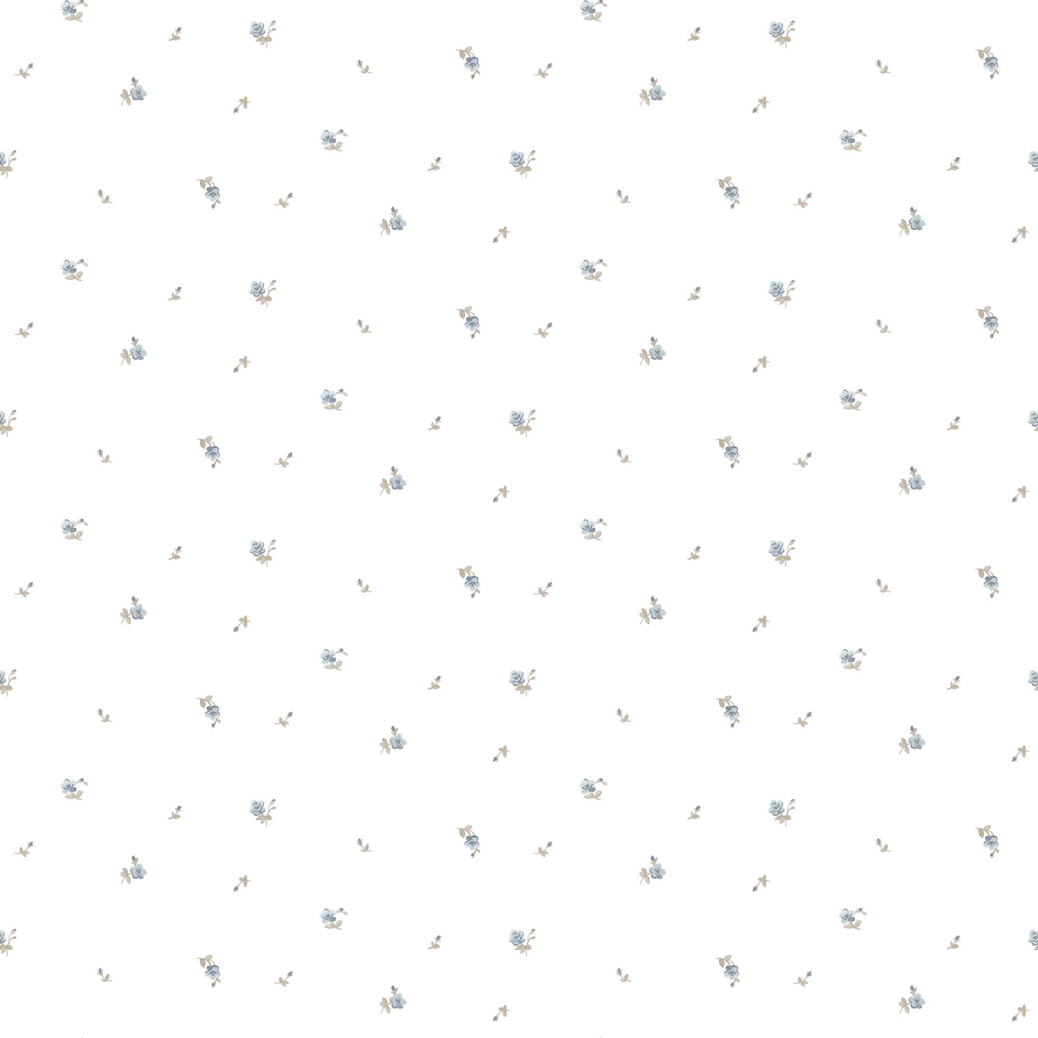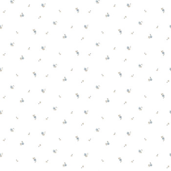 Matná, bílá vliesová tapeta s drobnými modrými růžemi na bílém podkladě imitující jemnou omítku.