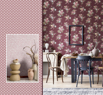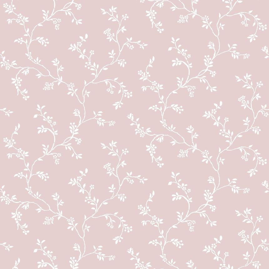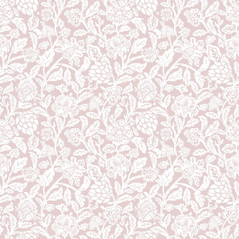Matná, růžová tapeta na zeď s bílým květinovým vzorem s listy, podklad imitující jemnou omítku.