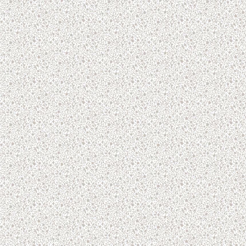 Matná, šedá vliesová tapeta na zeď se vzorem bílých rozkvetlých větviček na podkladě imitující jemnou omítku.