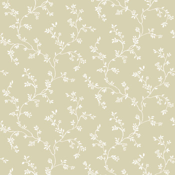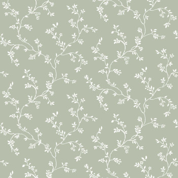 Matná, zelená vliesová tapeta na zeď se vzorem bílých rozkvetlých větviček na podkladě imitující jemnou omítku.