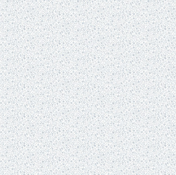 Matná, bílá vliesová tapeta na zeď s drobnými květinovými ornamenty v bledě modré barvě, podklad imitující jemnou omítku.