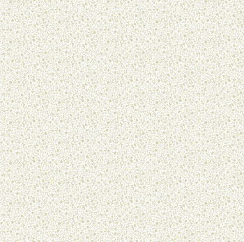 Matná, bílá vliesová tapeta na zeď s drobnými květinovými ornamenty v okrové barvě, podklad imitující jemnou omítku.