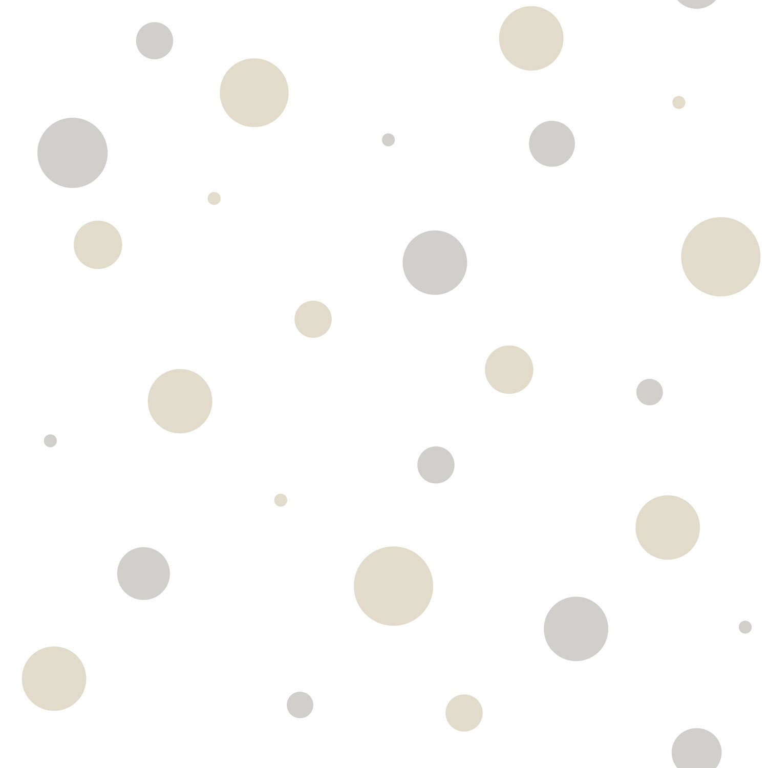 Hladká bílá vliesová tapeta na zeď, matné šedé a pololesklé béžové puntíky.