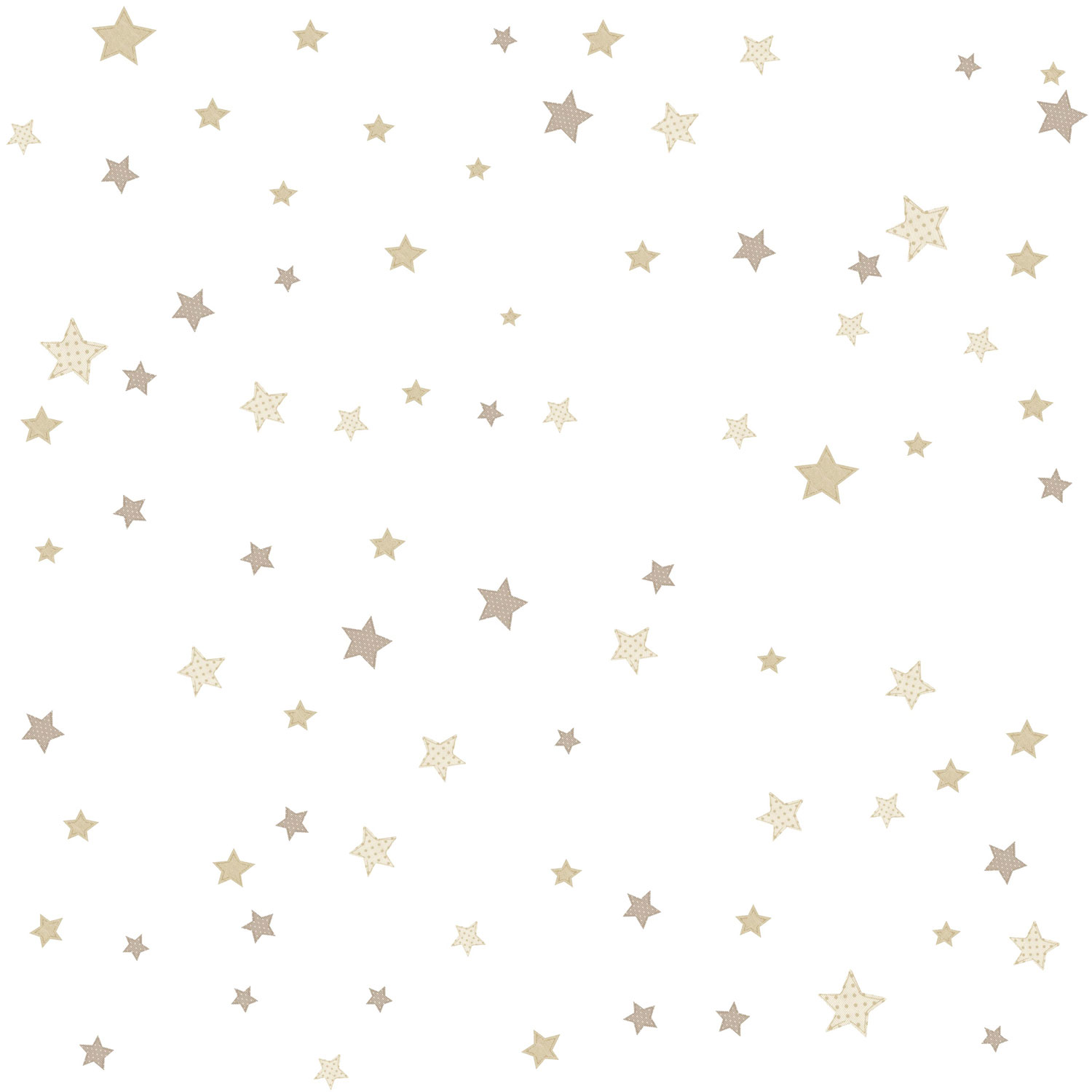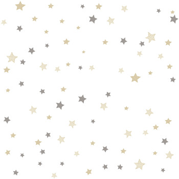Hladká bílá vliesová tapeta na zeď, hnědé a pololesklé béžové hvězdičky.