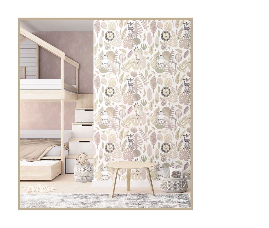 Hladká bílá vliesová tapeta na zeď, motivy zvířátek a listů v odstínech růžové, béžové, šedé a hnědé.