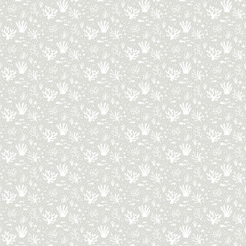 Jemně plastická šedo-bílá vliesová tapeta na zeď, motivy rybiček a vodních rostlin.