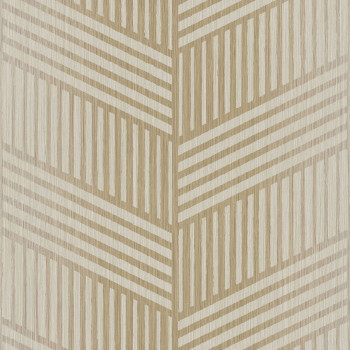 Jemně plastická, zlato-béžová vliesová tapeta s vinylovým povrchem, geometrický pruhovaný vzor s jemným leskem. Foto interiéru je pouze ilustrační - odlišné barvy.