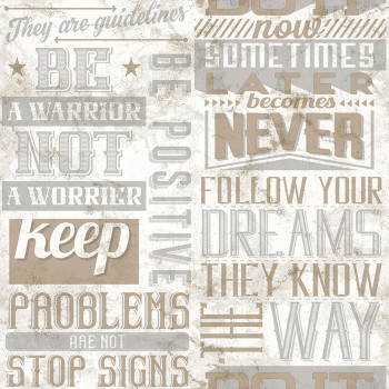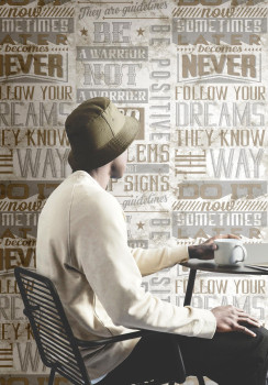 Vliesová tapeta nejen pro teenagery, nápisy v odstínech bílé, hnědé, stříbrné a zlaté.