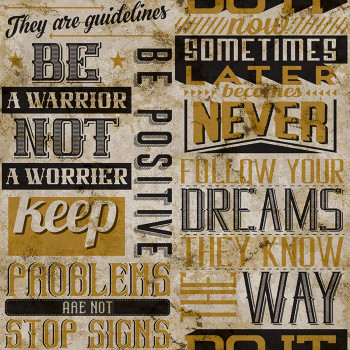 Vliesová tapeta nejen pro teenagery, šedo-béžový podklad, nápisy v odstínech černé a zlaté.