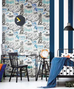 Šedá vliesová tapeta na zeď, graffiti v bílé, černé a modré.