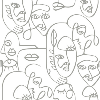 Hladká bílá grafická vliesová tapeta na zeď, motivy tváří, obličejů v odstínu světlého zlata.