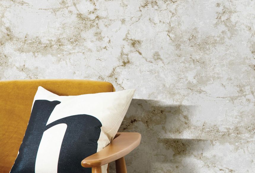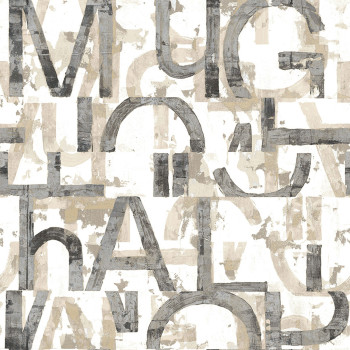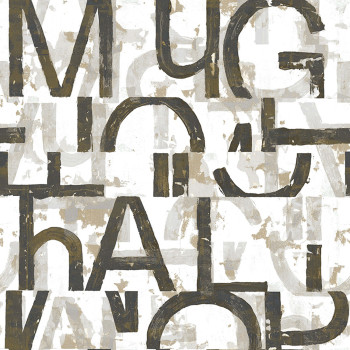 Hladká bílá vliesová tapeta na zeď, písmena v odstínech černé, šedé a hnědo-béžové.