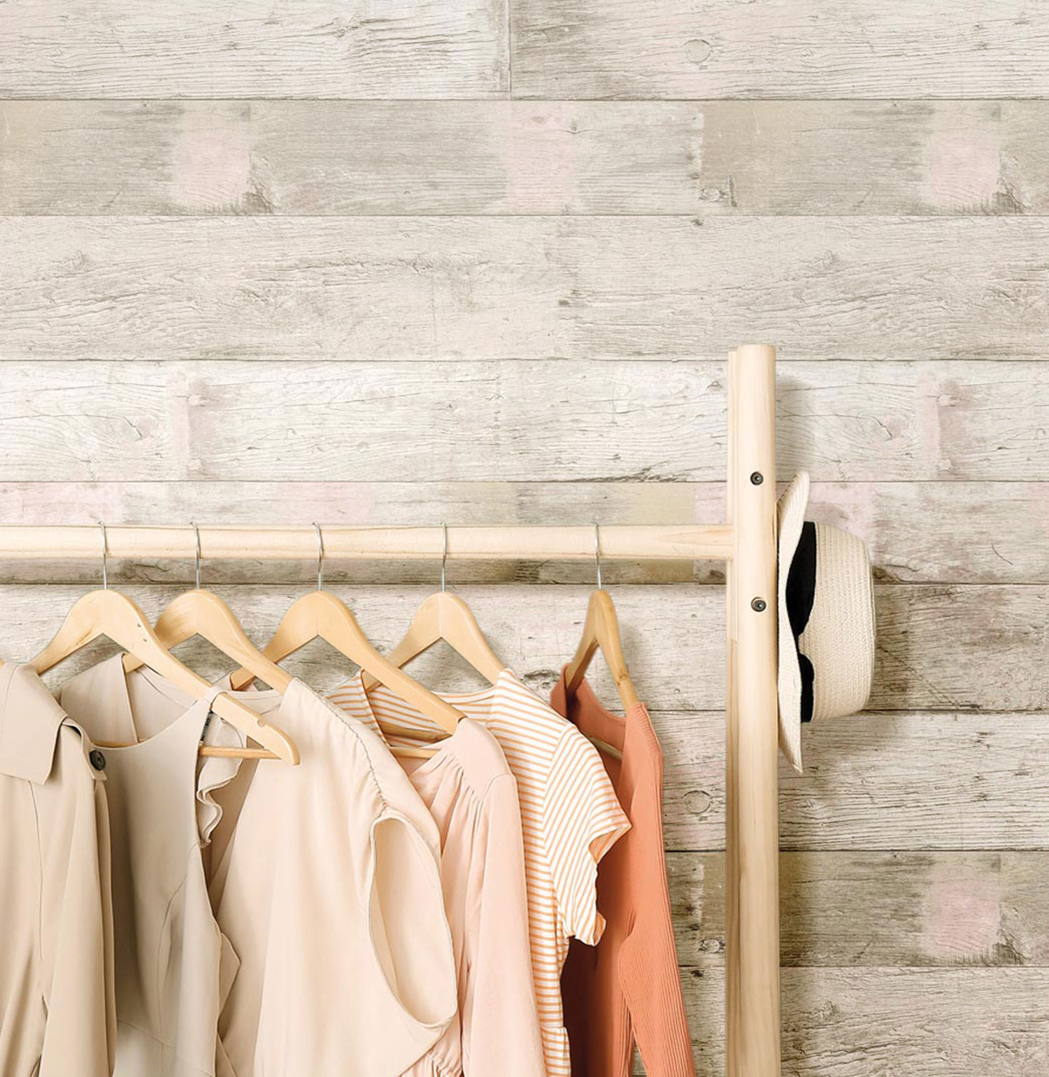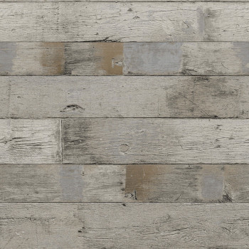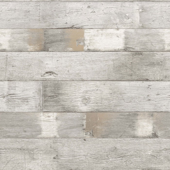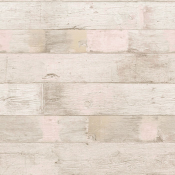 Hladká vliesová tapeta na zeď, imitace dřeva, dřevěných palubek, odstíny šedé, béžové a růžové.