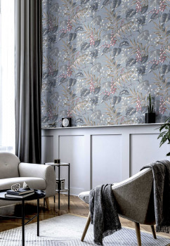 Jemně plastická, modrá pololesklá vliesová tapeta s vinylovým povrchem - motivy listů a rozkvetlých větviček v odstínech šedé, hnědé, béžové, modré a vínové.