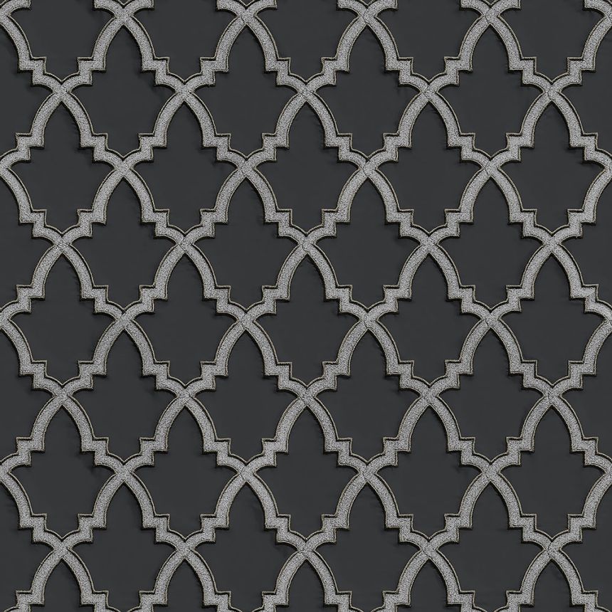 Vinylové tapety s vliesovým povrchem - na tapetách dochází ke spojení hedvábné textilie a výrazných metalických textur dodá vašemu interiéru luxus a styl. Podklad design černé textilie s jemným pololeskem, plastický geometrický ornamentální vzor. Textura vzoru stříbrná, obrysy zlaté s patinou.