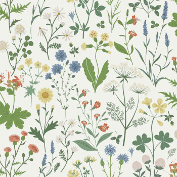 Bílá vliesová tapeta na zeď, motivy lučních květin.