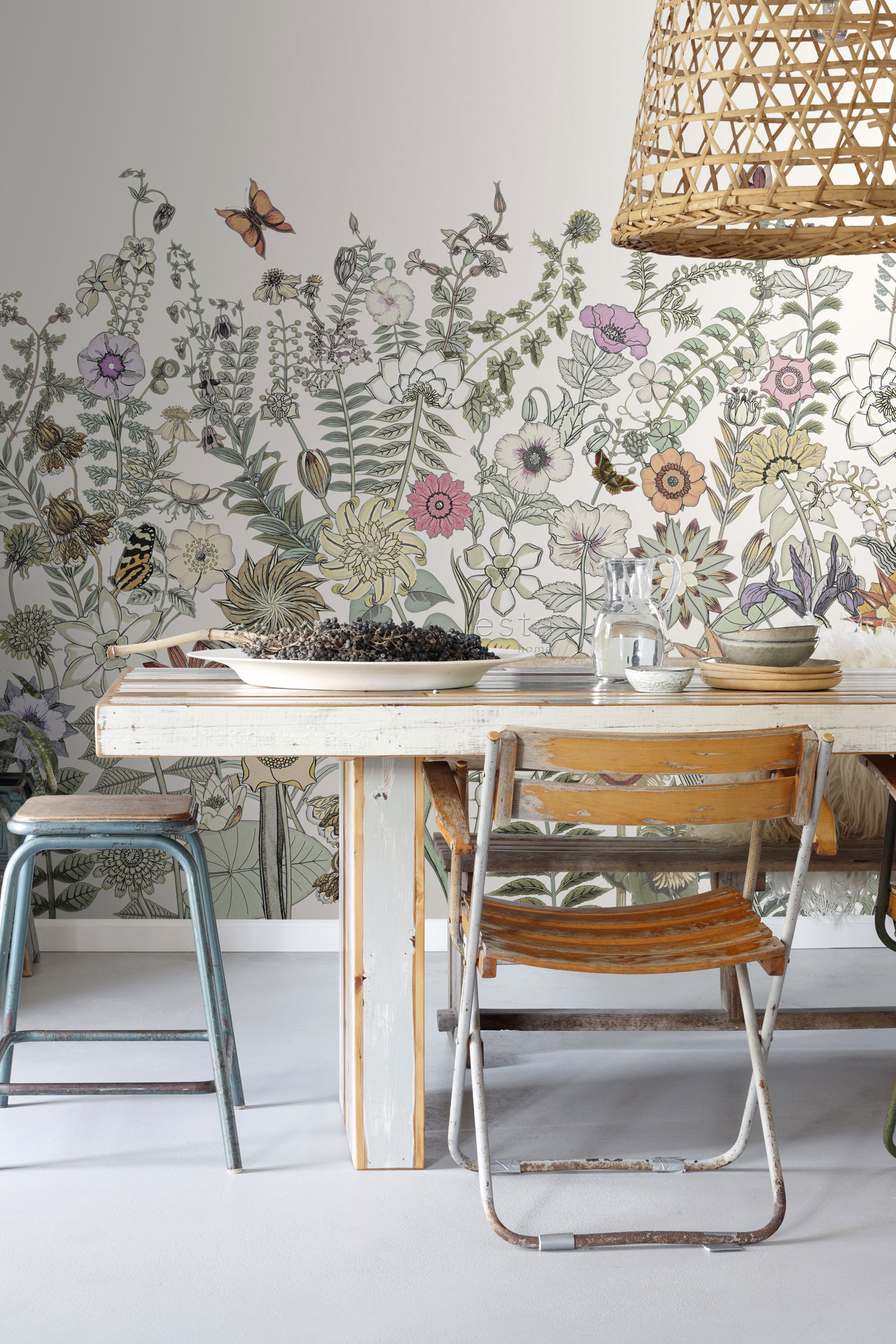 Když se tapety Vintage Flowers spojí s pečlivě vybranými kousky z vintage obchodů a láskyplně uchovávanými dědictvími, jako je například babiččino houpací křeslo, začnou se dít zázraky. Tento jedinečný mix stylů přináší do vašeho domova nejen neopakovatelný styl, ale i teplou, osobitou atmosféru plnou jedinečnosti a pohodlí. Vzniká tak prostor, kde každý prvek vypráví svůj příběh a společně tvoří harmonický celek, který je stejně působivý, jako je útulný.