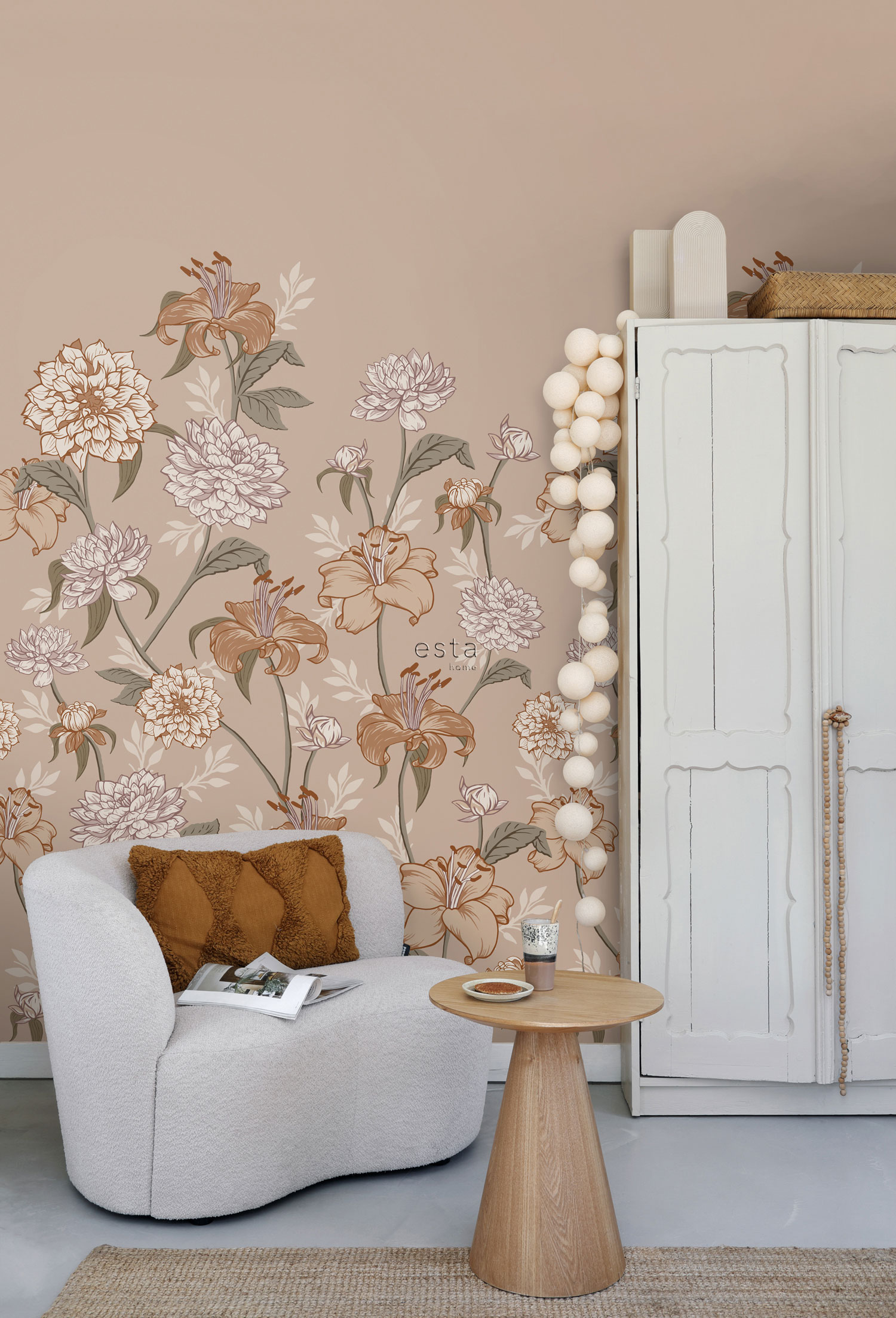 Když se tapety Vintage Flowers spojí s pečlivě vybranými kousky z vintage obchodů a láskyplně uchovávanými dědictvími, jako je například babiččino houpací křeslo, začnou se dít zázraky. Tento jedinečný mix stylů přináší do vašeho domova nejen neopakovatelný styl, ale i teplou, osobitou atmosféru plnou jedinečnosti a pohodlí. Vzniká tak prostor, kde každý prvek vypráví svůj příběh a společně tvoří harmonický celek, který je stejně působivý, jako je útulný.