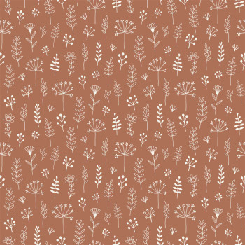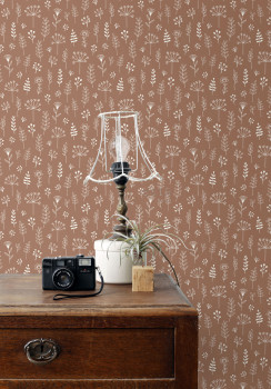 Hladká hnědá vliesová tapeta na zeď, motivy květin a listů.