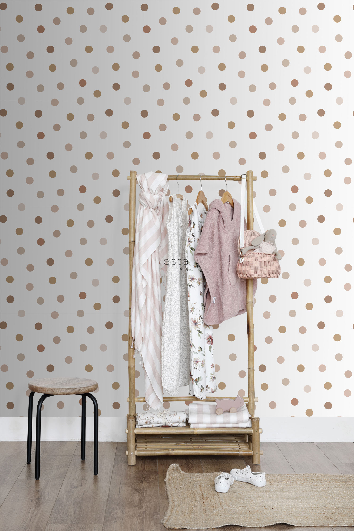 Bílá vliesová tapeta na zeď, puntíky v odstínech hnědo-růžové.