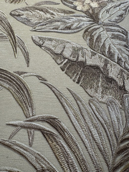 Luxusní vliesová tapeta s vinylovým povrchem, světle béžový podklad s jemným pololeskem, metalické textury v odstínech hnědé, hnědo-zlaté. Barvy a odlesky se mění podle dopadu světla na tapetu.