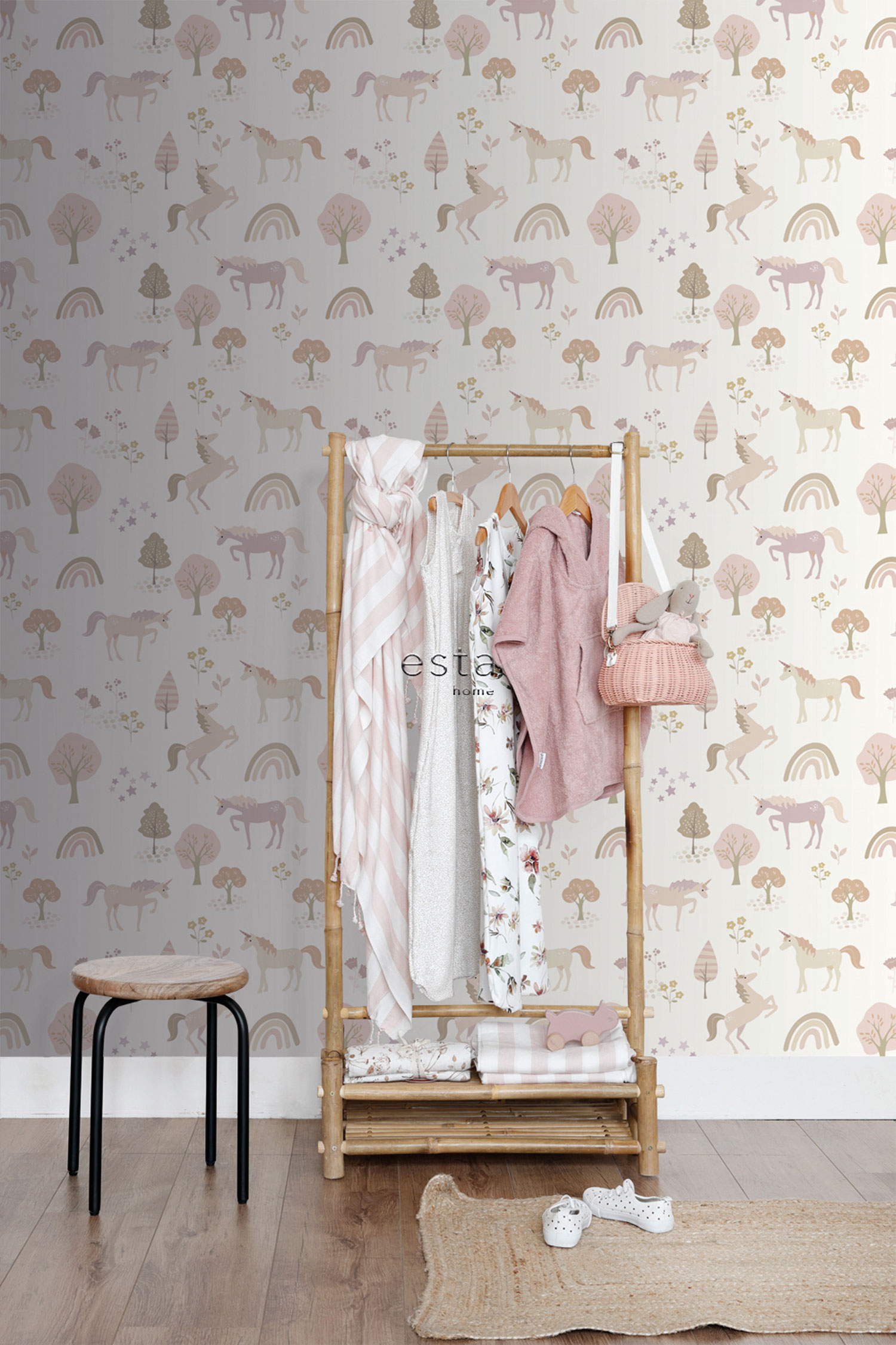 Hladká vliesová tapeta na zeď, stromy, duha, hvězdičky a jednorožci v odstínech béžové, hnědé, růžové a šedé.