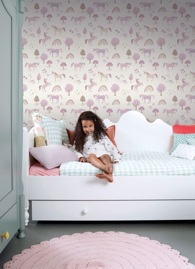 Hladká vliesová tapeta na zeď, stromy, duha, hvězdičky a jednorožci v odstínech lila, hnědé a béžové.