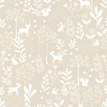 Hladká béžová vliesová tapeta na zeď, dětské vzory přírody a zvířátek.