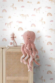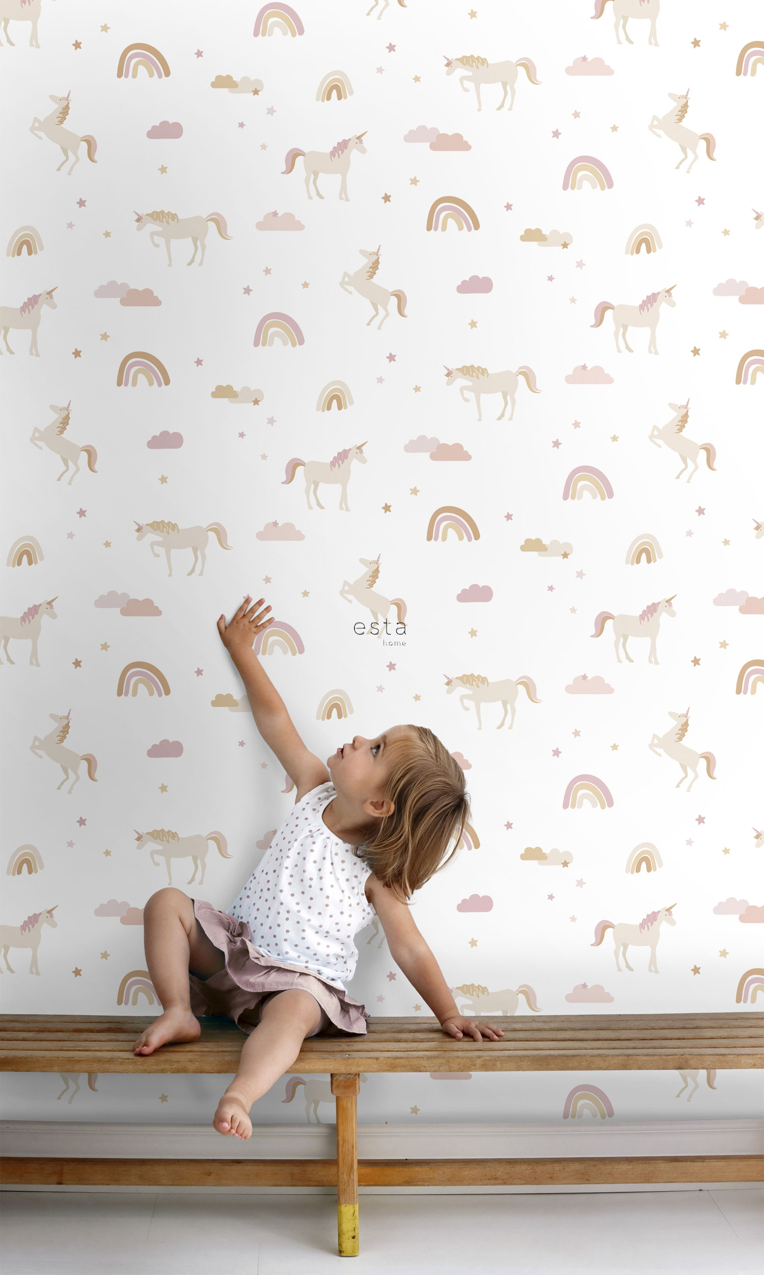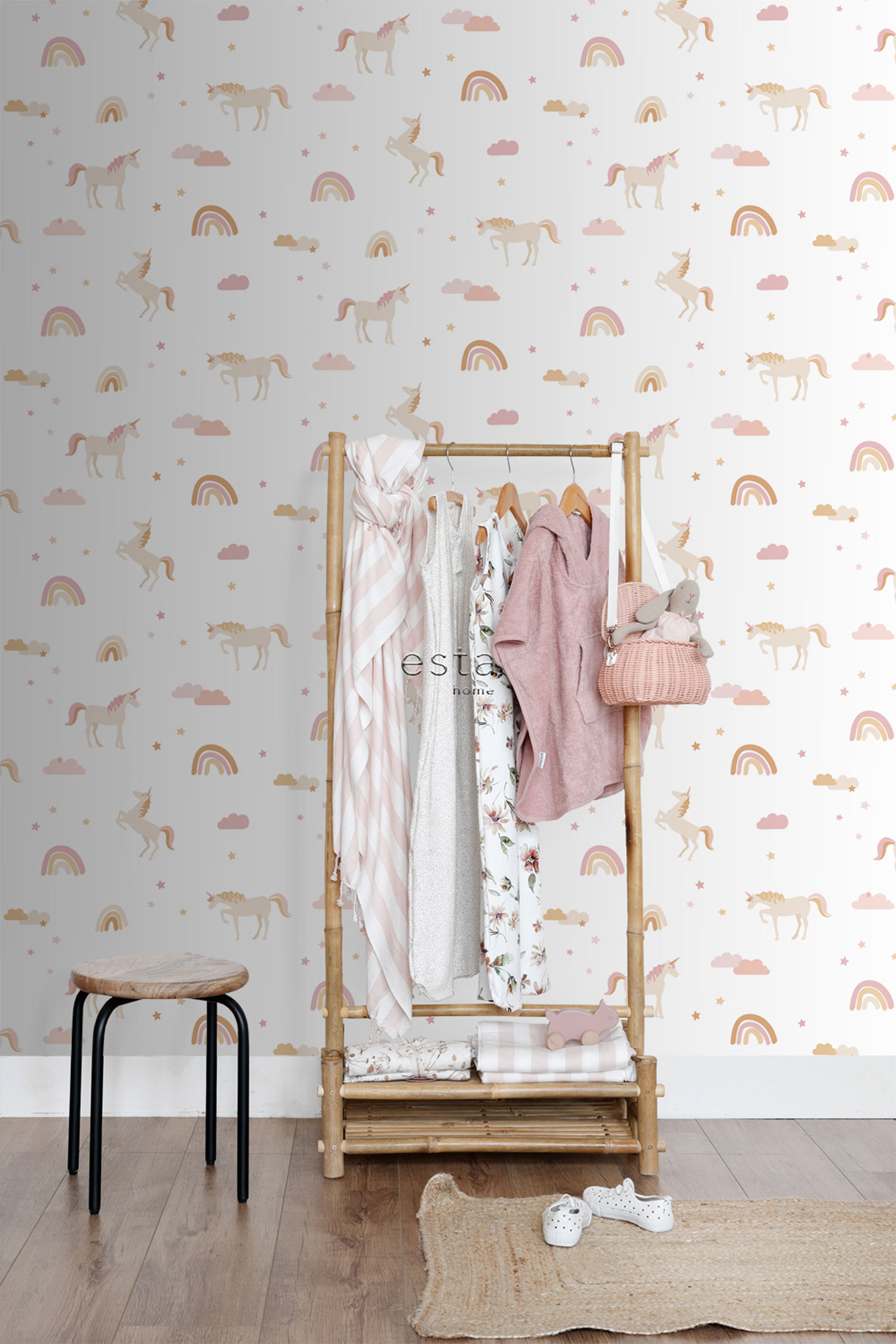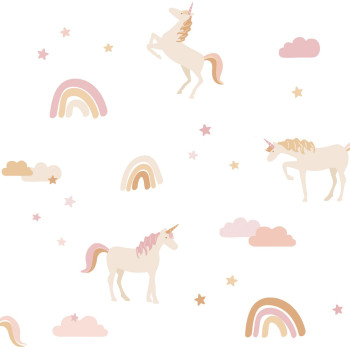 Hladká vliesová tapeta na zeď, stromy, duha, hvězdičky a jednorožci v odstínech šedé, okrové, růžové a hnědé.