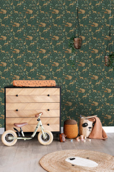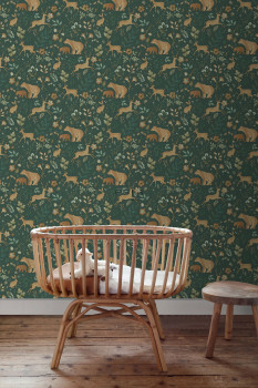 Tmavě zelená hladká vliesová tapeta na zeď, dětské vzory přírody a zvířátek v odstínech hnědé a zelené.