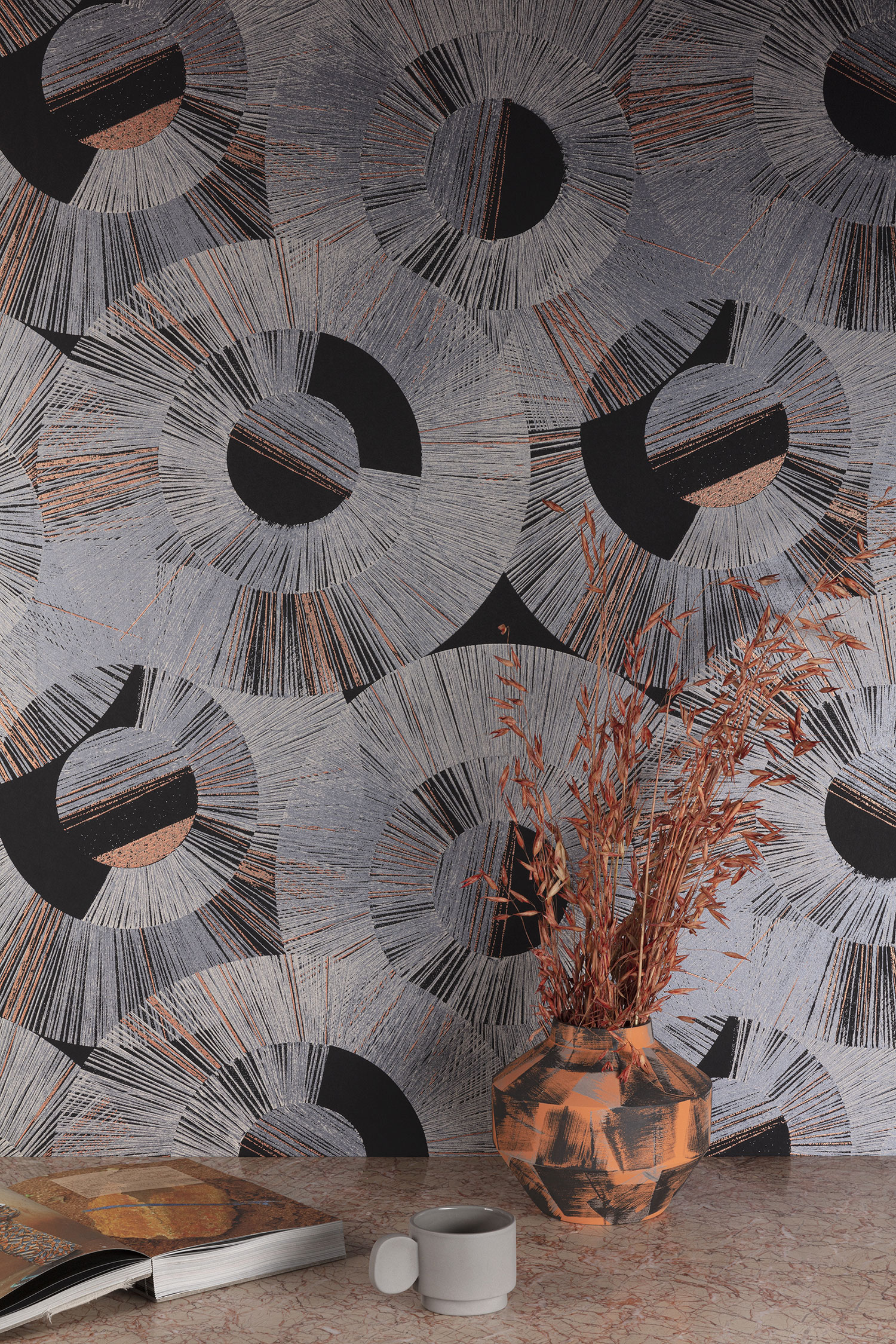• Geometrický vzor ve stylu Art Deco, který je nepravidelný a v teplých barevných odstínech