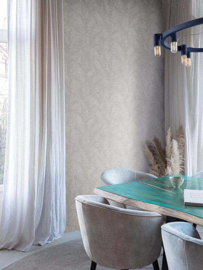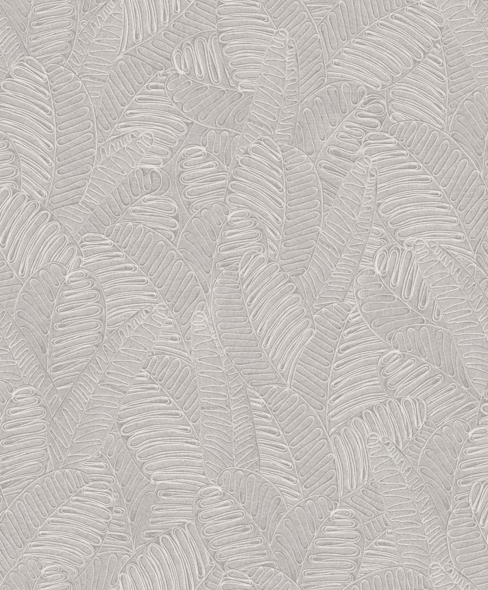 Jemně plastická vliesová tapeta na zeď, motivy listů v odstínech šedo-béžové s krémovými obrysy.