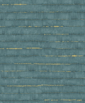 Vliesová tapeta na zeď, odstíny modré / tyrkysové, nepravidelné vodorovné zlaté pruhy.