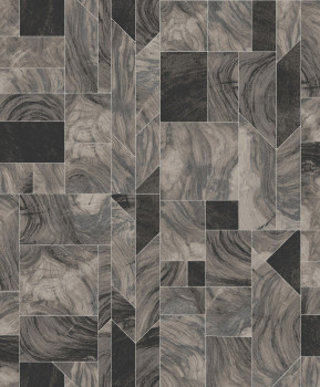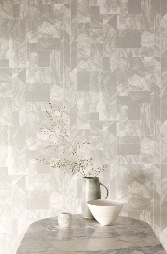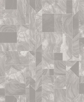 Mramorovaná vliesová tapeta na zeď, geometrický vzor v odstínech šedé, metalické stříbrné obrysy.