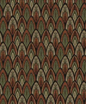 Jemně plastická vliesová tapeta na zeď, motiv listů v odstínech hnědé, zelené a zlaté.