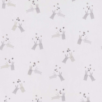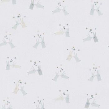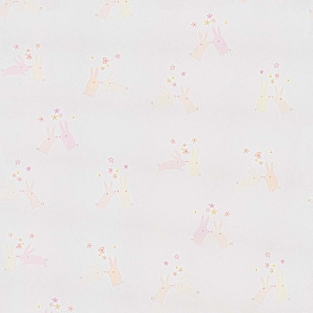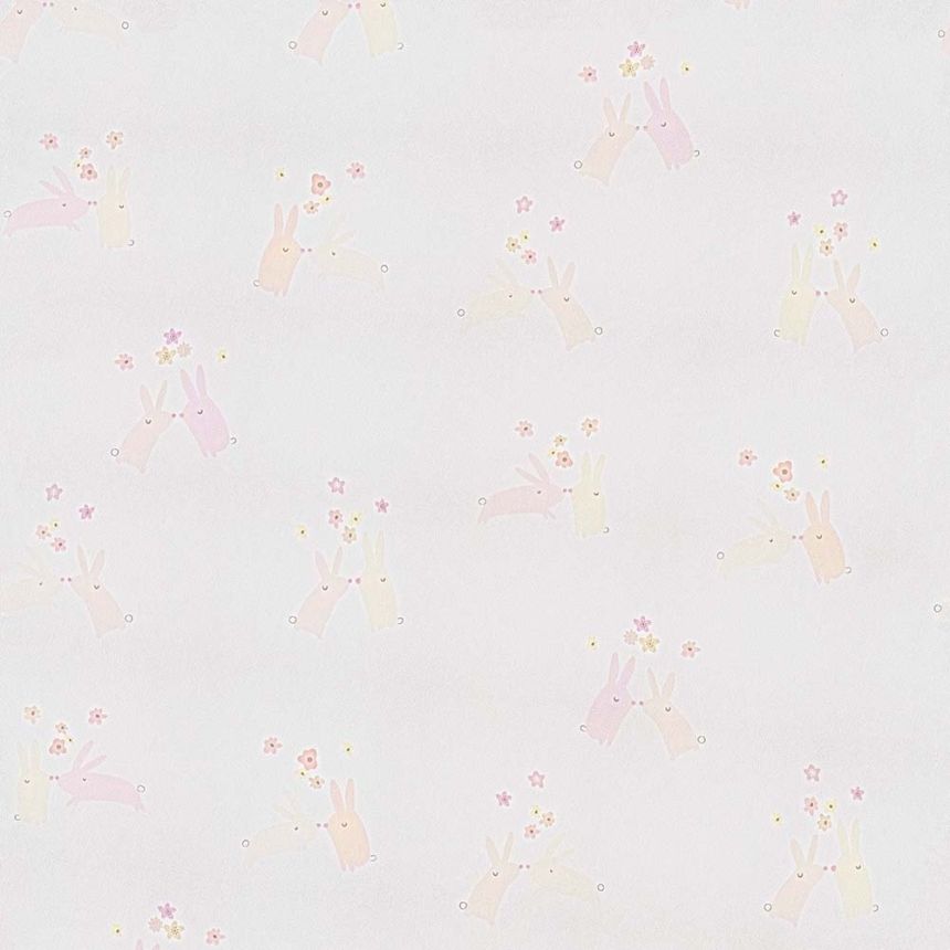 Vliesová, omyvatelná tapeta s jemnou krupičkovou strukturou. Králíčci a kytičky v růžových a okrových odstínech na smetanově bílém podkladu.