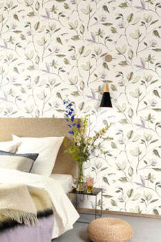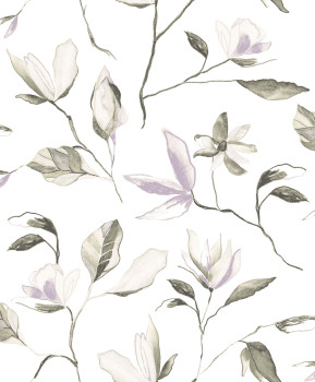 Smetanově bílá hladká vliesová tapeta na zeď, květinový vzor magnólií v odstínech lila, zelené a šedé.
