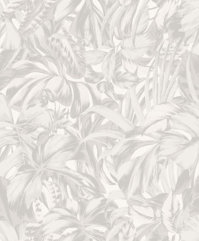 Šedo-bílá vliesová tapeta na zeď, motiv tropických listů.