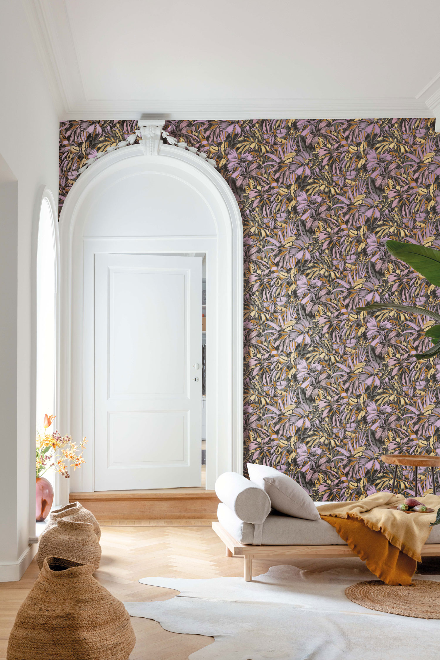 Vliesová tapeta na zeď, motiv tropických listů v odstínech hnědé, fialové a béžové.