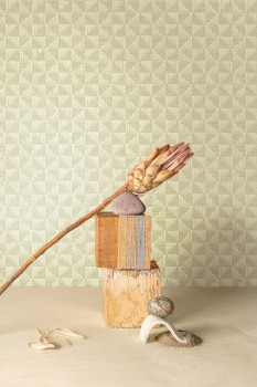 Vliesová tapeta na zeď, geometrické vzory iinspirované přírodní materiály v odstínech krémové a zelené.