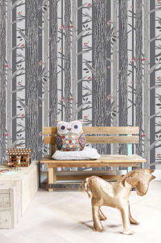 Vliesová, dětská tapeta. Zvířátka, ptáčci a včelky v lese. Šedočerné odstíny, zvířátka v šedých, růžových a žlutých barvách.