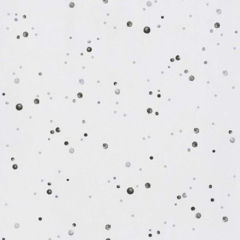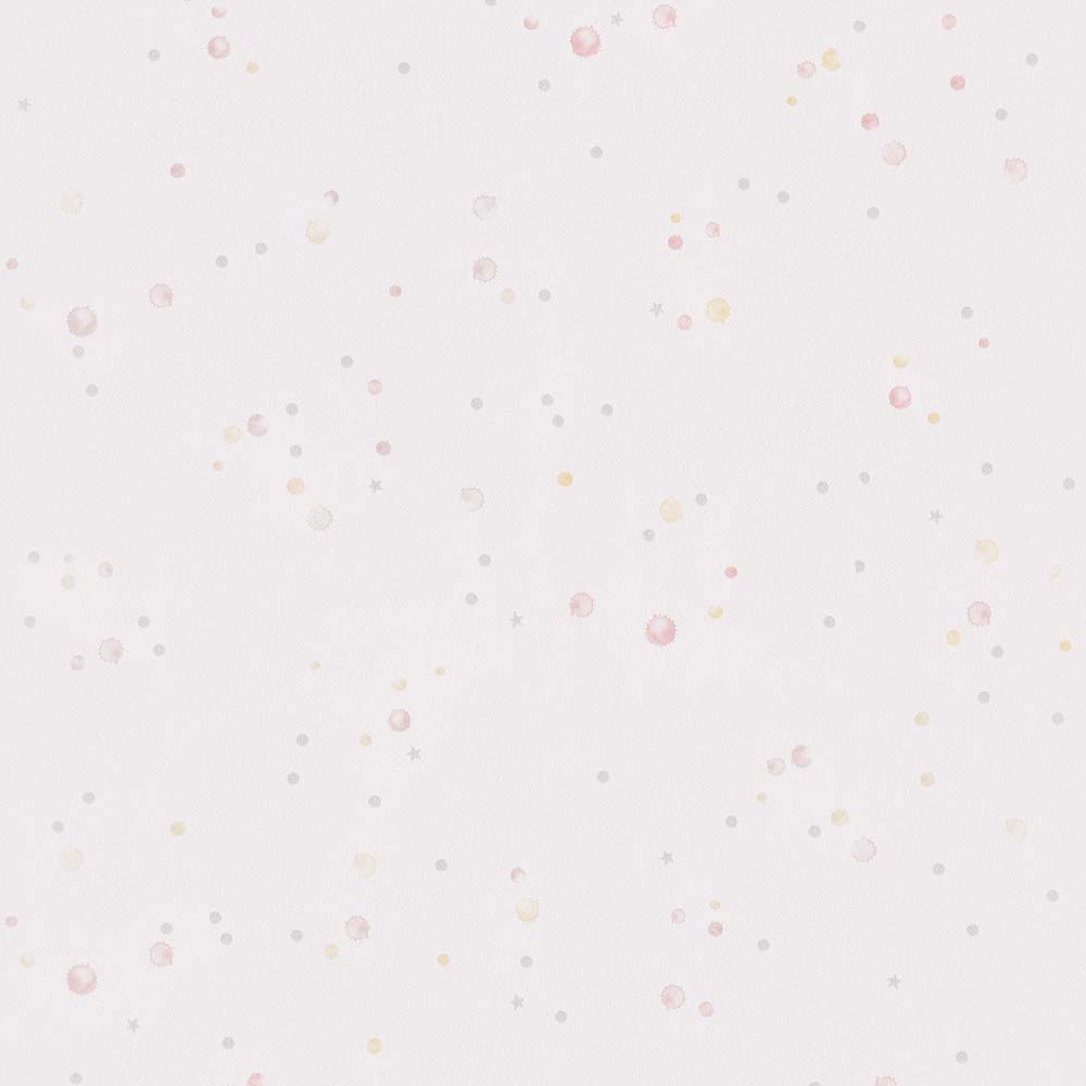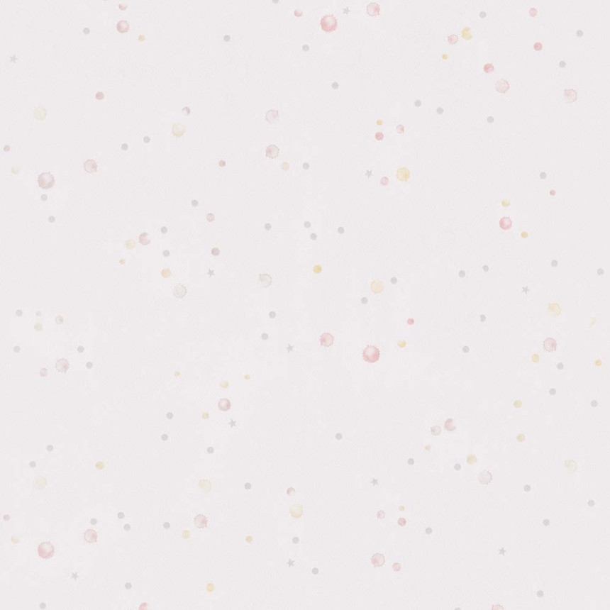 Vliesová, bílá tapeta. Žluté a růžové kaňky, stříbrná kolečka a hvězdičky.