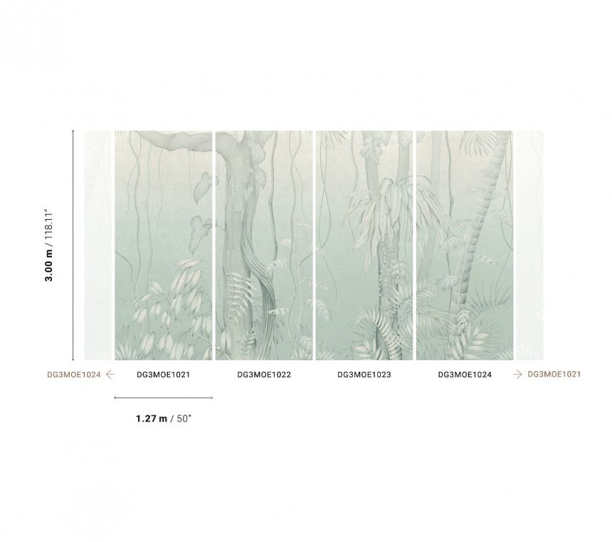 Šedo-modrá vliesová obrazová tapeta s motivem listů a stromů. Foto interiéru je pouze ilustrační Pro větší šířku lze kombinovat s fototapetami DG3MOE1022, DG3MOE1023 a DG3MOE1024 - viz foto