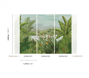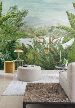 Vliesová obrazová tapeta s motivem tropického lesa a palem. Foto interiéru je pouze ilustrační Pro větší šířku lze kombinovat s fototapetami DG33RAI1031 a DG3RAI1033 - viz foto