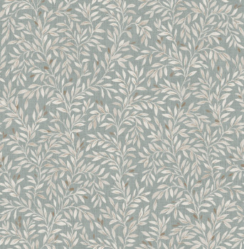 Hladká šedo-zelená / duck egg vliesová tapeta na zeď, motivy větviček s listy. Podklad má efekt tkaniny.