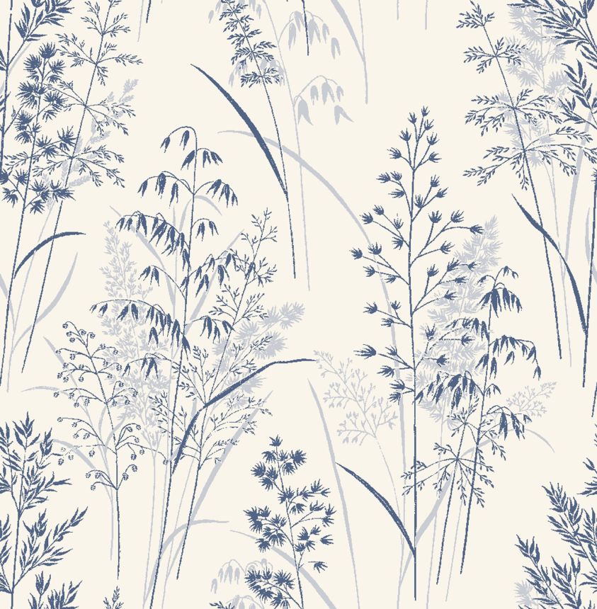 Hladká bílá vliesová tapeta na zeď, modro-fialová stébla luční trávy.