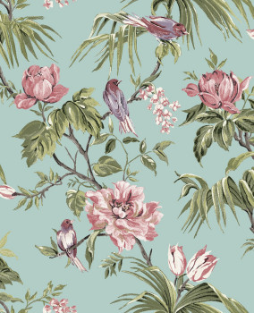 Romantická tyrkysová vliesová tapeta s ptáčky a rozkvetlými větvičkami.